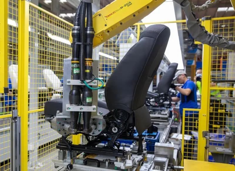 螺栓自动拧紧系统如同电影“大黄蜂”的机械手臂,流水线每推过来一个座椅,机器“啪”地如同相机拍摄一下,随之,机器手臂接受指令,旋转到精确位置之后,一下子将螺栓拧紧;流水线的尽头,另外一头的“大黄蜂”机械手臂自动抓取重达20公斤的座椅,轻松地放置在出货区。