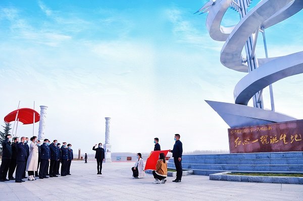 活动伊始,支部全体人员参观了南坦“红心一号”文化广场,作为黄河上第一艘吸泥船“红心一号”的诞生地,文化广场展现了齐河治黄人接续奋斗、担当有为的生动历程。在广场中央,两个支部的党员干部向着党旗庄严宣誓,“我志愿加入中国共产党,拥护党的纲领,遵守党的章程……”在滔滔黄河的奔流声中,铿锵有力的入党誓词响彻广场。