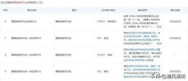 同时,潍坊市宇虹防水材料(集团)有限公司已多次被寿光市人民法院列为被执行人,被执行总金额3162万元。
