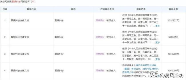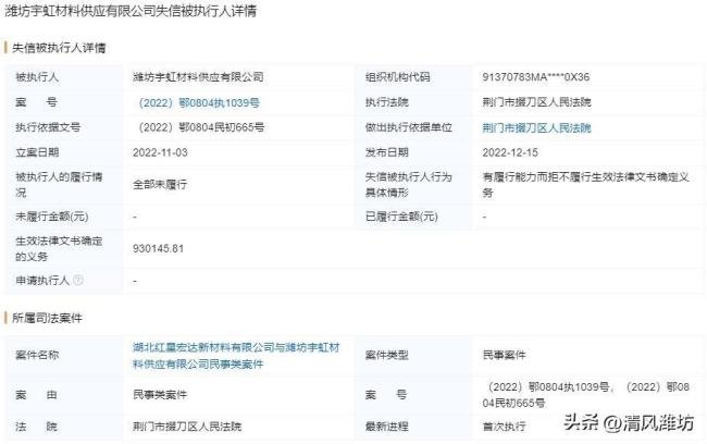 平台显示,潍坊宇虹材料供应有限公司自2022年8月至今已13次因未按时履行法律义务而被法院强制执行,被强制执行额度已达30536804元。