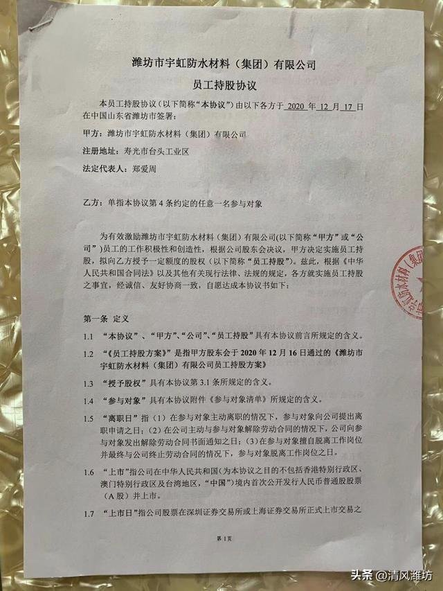 据企业员工透露,潍坊市宇虹防水材料集团为“上市”,并召开了员工持股动员大会,下发了《潍坊市宇虹防水材料(集团)有限公司员工持股方案》(以下简称《持股方案》)。