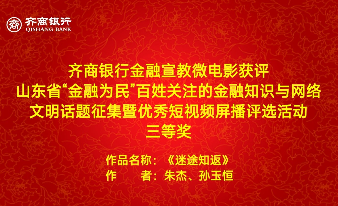 近日,中国人民银行济南分行、山东银保监局、山东证监局、省网信办、省地方金融监管局等单位联合下发了《关于“金融为民”百姓关注的金融知识与网络文明话题征集暨优秀短视频屏播评选活动获奖情况的通报》,齐商银行总行营业部员工拍摄制作的微电影《迷途知返》荣获此次活动三等奖!