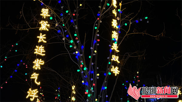 在北京路绿化带内设置的沂蒙飞歌、生肖贺岁、嫦娥奔月、玉兔迎春、九天揽月等灯光小品,既有传统元素,又展示了时代气息,营造了奋发向上过春节的浓厚氛围,五洲湖广场北侧的小树林悬挂着彩色灯带和古诗文灯串。点亮的古诗文主要选取描写琅琊八景、兰亭序、蒙山古诗词、春节古诗词等内容。游人漫步其中,宛然徜徉于字里行间,能深深体会沂蒙大地之壮阔秀美,传统文化之博大深远。