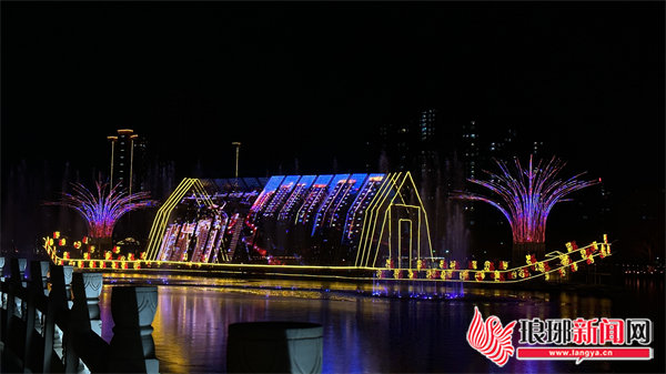 临沂市文化公园此次节日亮化,遵循“绿色低碳、循环利用”的理念,突出兔年特色。公园内的五洲湖,重点打造“琅琊”号灯光篷船,篷船巨屏循环展播春节祝福、沂蒙精神、人文历史、城市发展等内容。屏幕两侧10米高的“烟花灯”五彩缤纷,湖内音乐喷泉、水幕电影交相辉映,正是“琅琊启航新时代,火树银花耀五洲”。