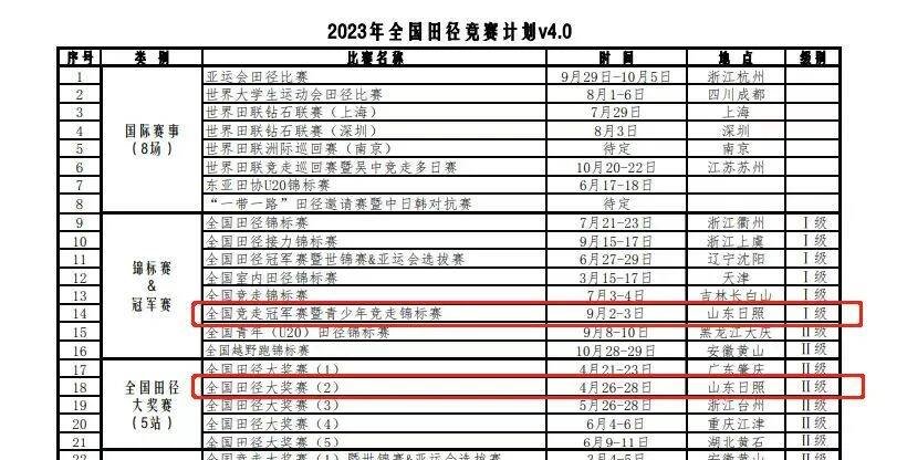 齐鲁网·闪电新闻2月10日讯 据中国田径官网最新公布消息,2023年全国田径大奖赛、全国竞走冠军赛暨青少年锦标赛花落日照。