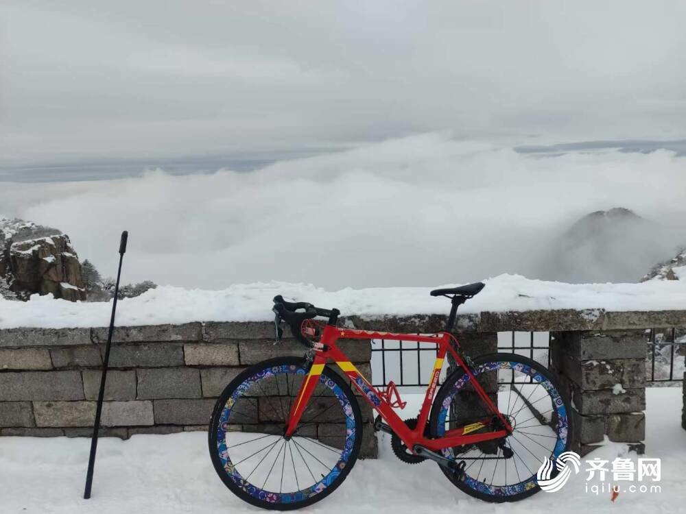 这名小伙叫刘学情,是济南人。他表示,自己平时就喜欢骑车、爬山、跑步,2021年时也曾效力过商业车队,因此身体素质比较好,带自行车登泰山基本没有难度;但在泰山十八盘一段,由于山路陡峭且路程较长,还是感觉很累,中途要歇三四次才能上去。另外,由于当天风雪交加,台阶上结了冰,为了安全起见,他把自行车留在了天街,准备日后等天气好一些再去把车扛下来。