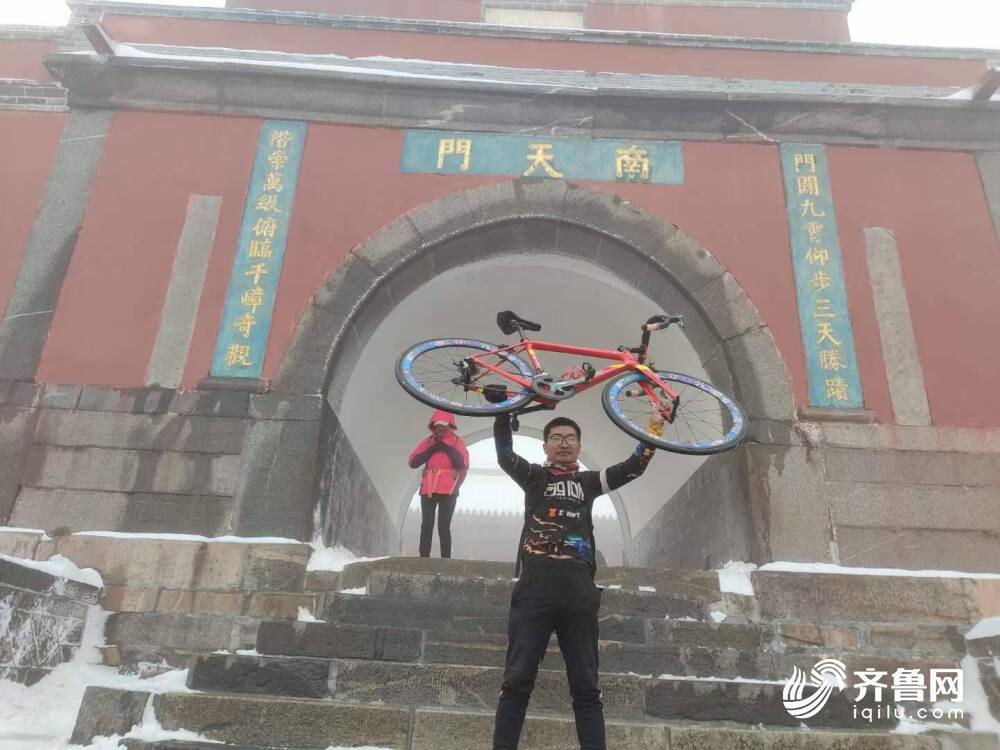 原标题:大雪中4小时扛自行车登顶泰山 山东00后小伙“车疯”:欢迎全国朋友来感受泰山文化