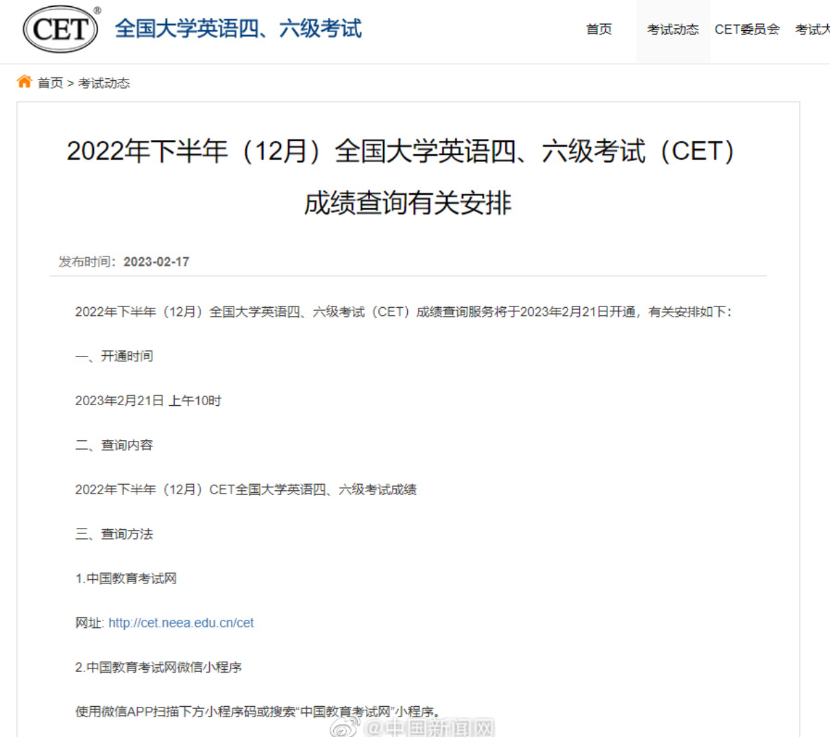 2022年下半年(12月)全国大学英语四、六级考试(CET)成绩查询服务将于2023年2月21日上午10时开通。