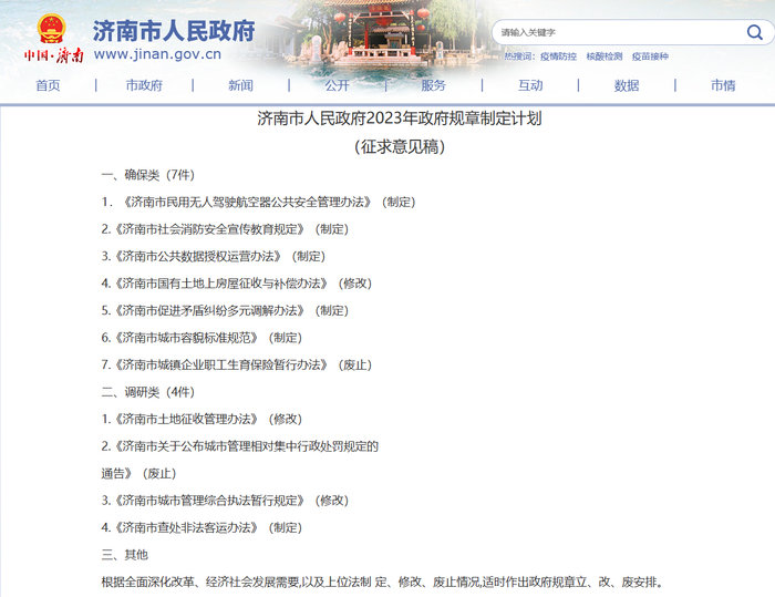 近日,市政府网站公布《济南市人民政府2023年政府规章制定计划(征求意见稿)》,并面向社会公开征求意见。征求意见截止时间为2023年3月14日。