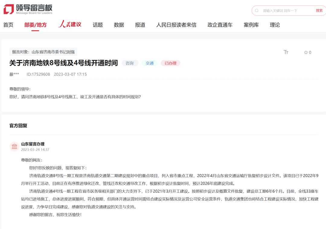 济南轨道交通4号线一期工程在省市区各级相关部门的大力支持下,已于2021年3月开工建设。按照初步设计及概算文件批复,建设总工期6年6个月。目前,全线33座车站均已进场施工,总体进度进展顺利,符合预期,但具体开通运营时间需结合建设实际情况及运营公司安全运营条件,轨道交通集团也将结合工程建设实际情况,加快工程建设进度,力争早日完成建设。