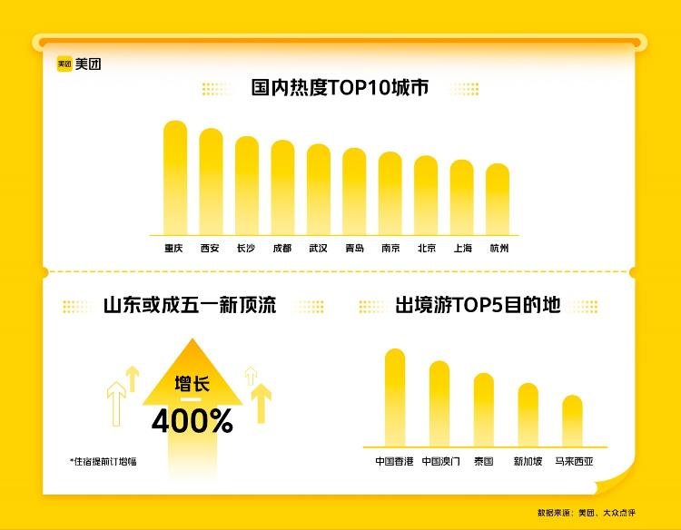 综合美团上住宿、景区、交通等旅游相关订单,重庆、西安、长沙、成都、武汉、青岛、南京、北京、上海、杭州,成为国内热度最高的十大目的地城市;从出发地来看,北京、上海、成都、重庆、武汉的人群出游热情更为高涨。