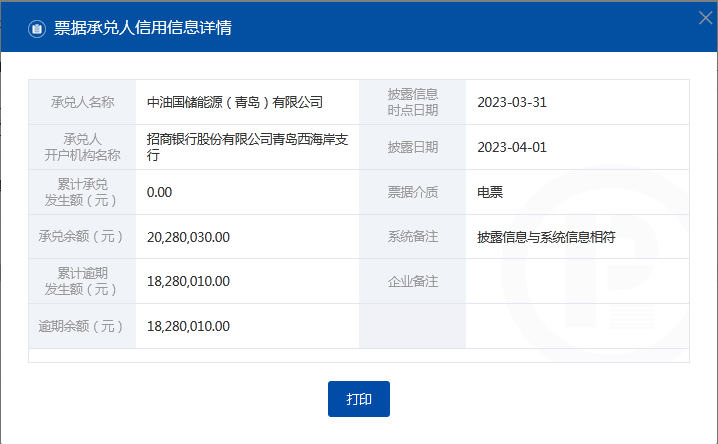 上海票据交易所官网“信息披露平台”栏目中的票据承兑人信用信息详情显示,截至披露日期4月1日,中油国储能源(青岛)有限公司在开户机构招商银行股份有限公司青岛西海岸支行的累计逾期发生额18,280,010.00元,逾期余额18,280,010.00元,累计承兑发生额0.00元,承兑余额20,280,030.00元。