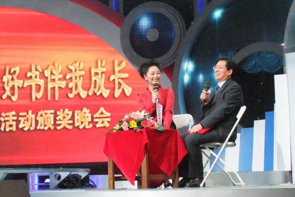 在山东省十大书香人家颁奖晚会上接受主持人李敏采访