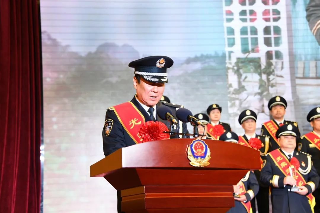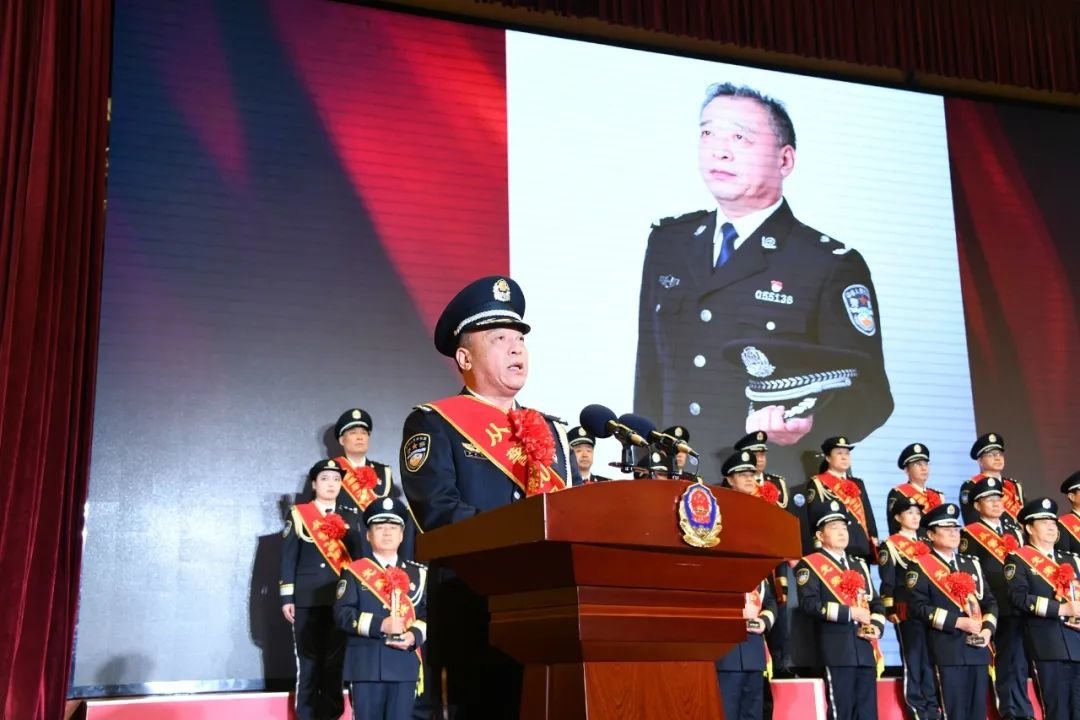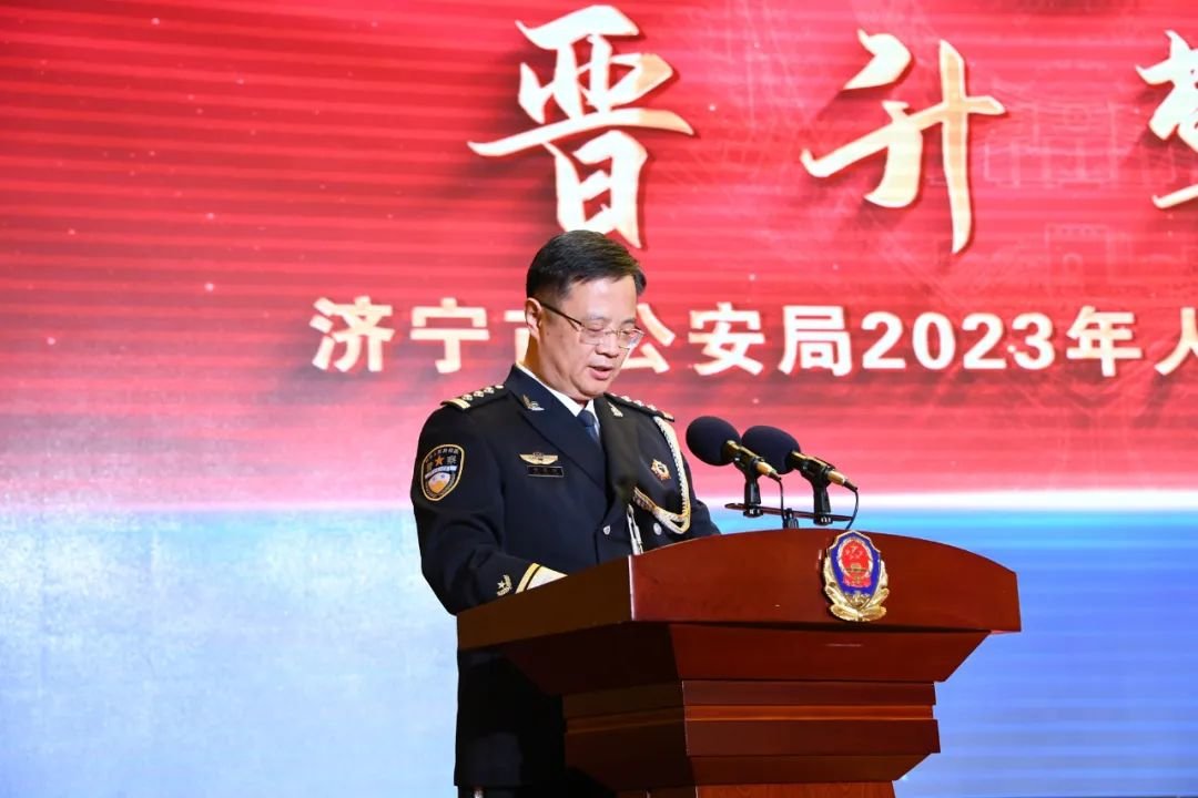 李海洋在致辞中指出,一代又一代济宁公安人在党的坚强领导下,薪火相传、接续奋斗,创造了属于济宁公安的业绩和荣光。今天,为济宁公安事业奉献年华的老同志们即将卸下戎装、光荣退休,但他们的光辉和功绩将永载济宁公安史册。在全市公安战线奋战的从警特定年限民警和荣获基层工作荣誉奖的民警,他们孜孜不倦追求公安事业的发展进步,见证了济宁公安昨天的荣光和辉煌,也承载着济宁公安明天的责任与担当。宣誓入警的新同志,是济宁公安的未来和希望,市公安局党委和全市公安民警欢迎他们成为济宁公安的一员。新警同志要牢记入警誓言,传承老一辈优秀品质,勤学苦练、迎难而上、正道直行,做忠诚信仰的守护者、做实干兴警的行动派,在从警之路上披荆斩棘、建功立业,为济宁公安事业贡献青春芳华和智慧力量。晋升警监警衔,是人民警察职业生涯的莫大荣誉和激励。晋升警监警衔的同志们要以此为新的起点,始终保持谦虚谨慎、戒骄戒躁的作风,再接再厉、真抓实干,努力争当济宁公安的干将和闯将,不辜负党和人民的信任与重托。