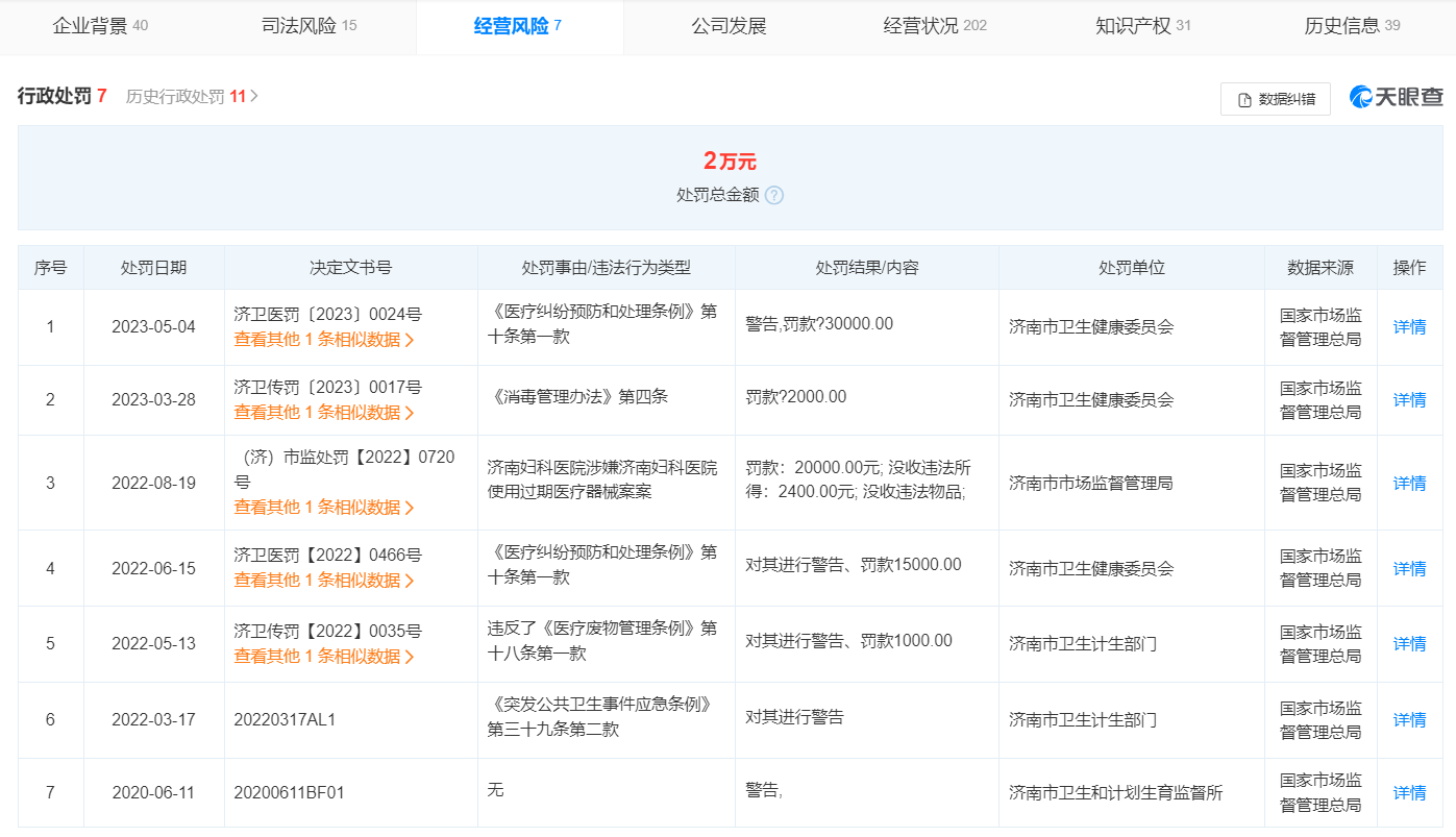 据天眼查经营风险一栏显示,济南妇科医院历史行政处罚超过十条,自2022年3月至今,因不同处罚事由或违法行为被行政处罚达6条之多。