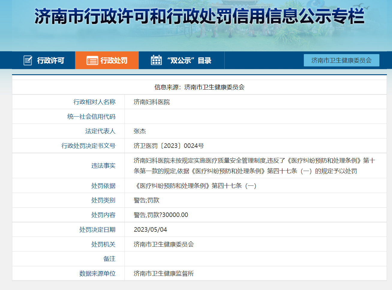 凤凰网山东(报料微博@凤凰网山东)从济南市行政许可和行政处罚信用信息公示专栏获悉,济南妇科医院未按规定实施医疗质量安全管理制度被罚30000.00元。处罚决定日期为2023年5月4日。