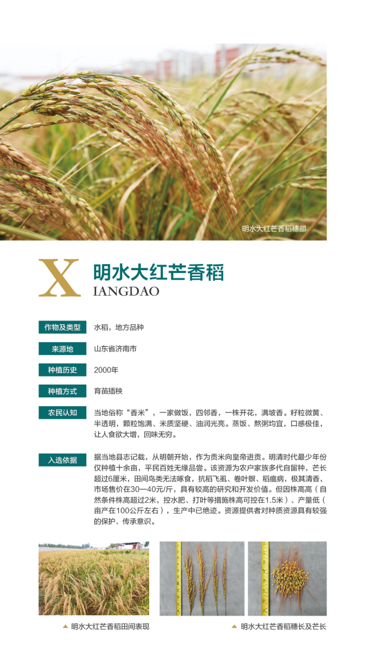 十大优异农作物种质资源均为2022年在全国农作物种质资源普查中新发现的珍稀特色、具有创新开发利用价值的地方品种。明水香稻产于百脉泉水的泉头一带,已有2000年的种植历史,据《济南府志》记载:“稻非此地常产,历章诸处稍稍有之,其美者则以章丘明水为最。”明水香稻当家种“大红芒”,以其独有的特质和优良纯正的口感,历来享有无上的盛名,是享誉全国的名产。因其产地百脉泉一带遍地涌泉,土肥水足,故所产稻米又称“泉头米”。