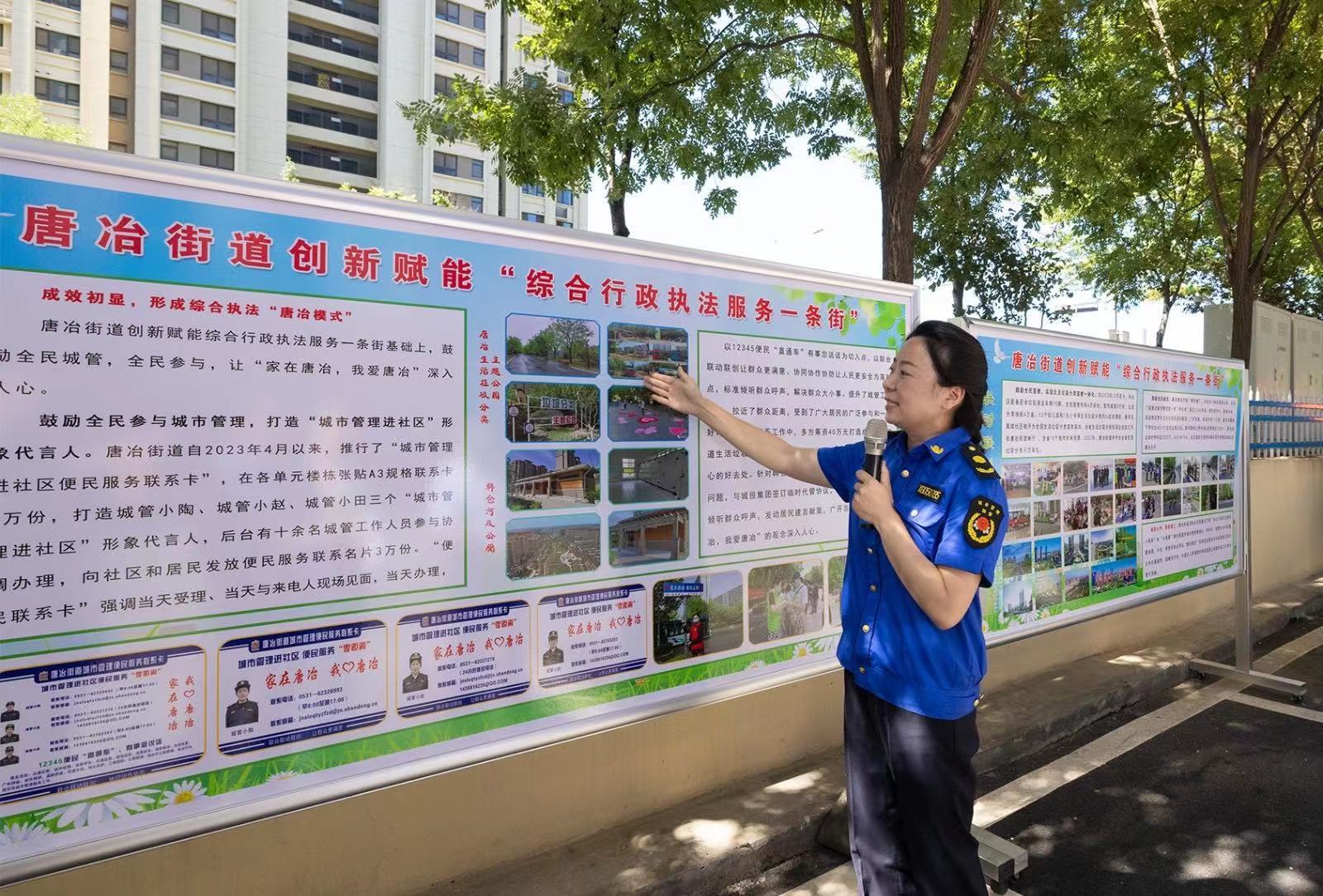 “打通城市管理‘最后一百米’,实现便民服务‘零距离’”,唐冶街道党工委书记李琰表示,“街道聚焦群众身边的城市管理难题,以‘人民城市人民建,建好城市为人民’为目标,树立‘全民城管’意识,构建了‘大城管’城市管理模式。积极打造‘综合行政执法服务一条街’,牵头创新构建‘部门+网格’三级管理体系和‘1+10+N’部门联动机制,解决了一大批市民关心的热点、难点问题和身边事、眼前事”。
