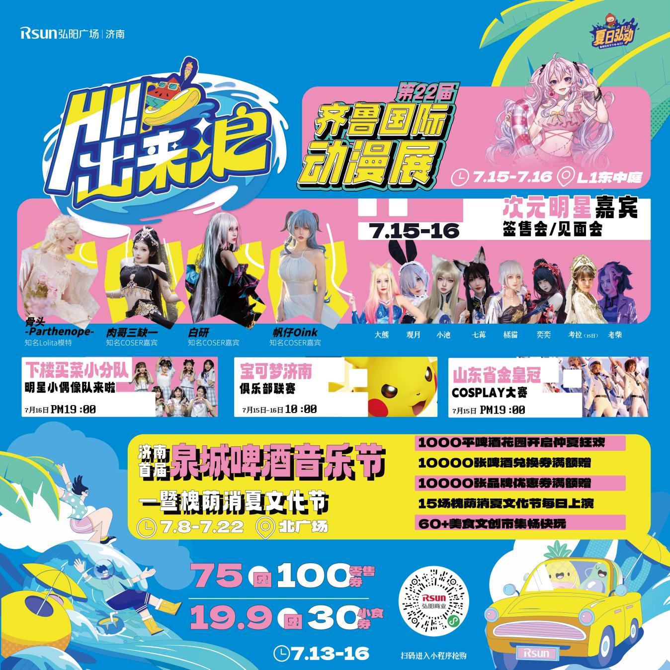 除了火力全开的COSPLAY大赛,本次动漫展每天都将邀请多位本地动漫Coser大V担当宣传推广官,在活动现场带来舞台大秀,与观众舞台互动,让观众近距离感受动漫的魅力。作为济南首次大型免费漫展的举办地,济南弘阳广场也将开展“夏日弘动3.0”主题系列活动,7-8月首届泼水节,七夕心跳实验室等众多活动精彩纷呈,拥抱更多青春活力,期待与更多动漫爱好者们“磁场共振”,开启潮趣夏日生活!