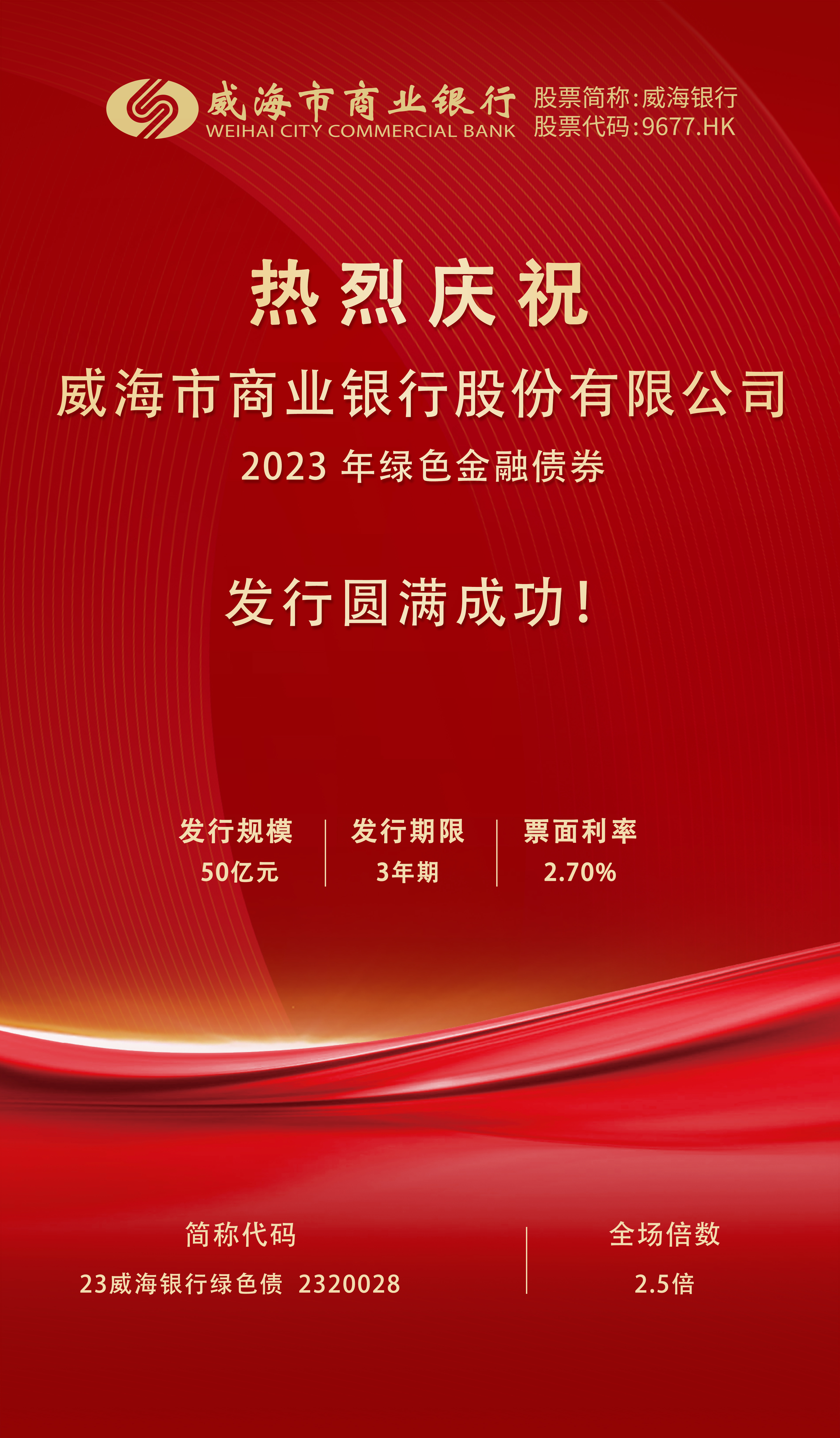 7月14日,威海市商业银行成功发行50亿元绿色金融债,标志着今年省内城商行首笔绿色金融债券顺利落地。本期债券票面发行利率2.70%,发行期限3年,本次发行得到市场上合格投资者的积极认购,充分展现出投资者对威海市商业银行绿色金融高质量发展的高度认可。