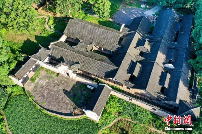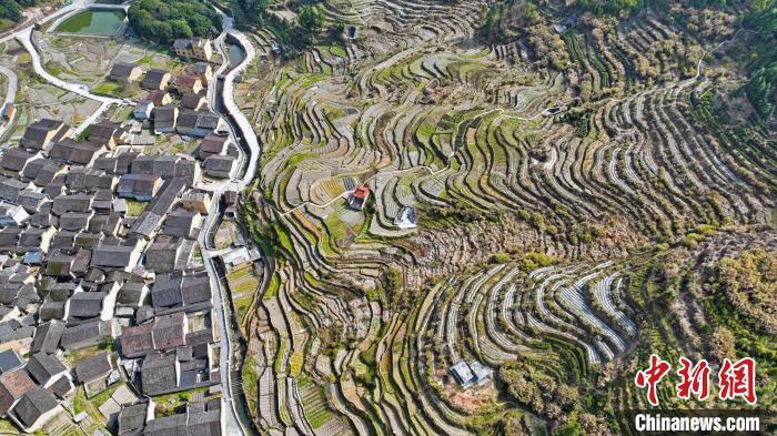 资料图:航拍吴峰村,黄墙黛瓦古民居与层层梯田相融。 褚子强 摄