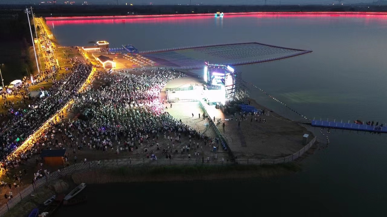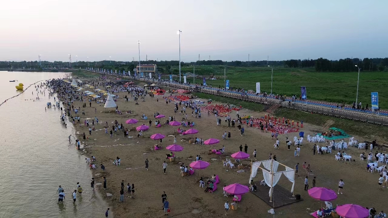 一水护田将绿绕,两山排闼送青来。月亮湾景区位于宁阳县堽城镇美丽的月牙湖畔,距离宁阳县城约10公里,是该县今年新开发的亲水型文旅项目。这里常年保持水面1800亩,目前景区一期建设了5.2公里环湖木栈道、1.2公里月光沙滩、2公里塑胶跑道,三处水库湿地,以及海湾浴场、游艇码头、七彩花海、花园式停车场等内容,配备了电瓶车、趣味脚踏车、美食广场等交通餐饮配套,以及沙滩帐篷、遮阳伞、休闲座椅、淋浴房等休闲设施。近期正逢高温天气,玩水成为夏季出游的热门选项,如今宁阳县城及周边群众不用去海边,便可度过这沙滩上的夏天。