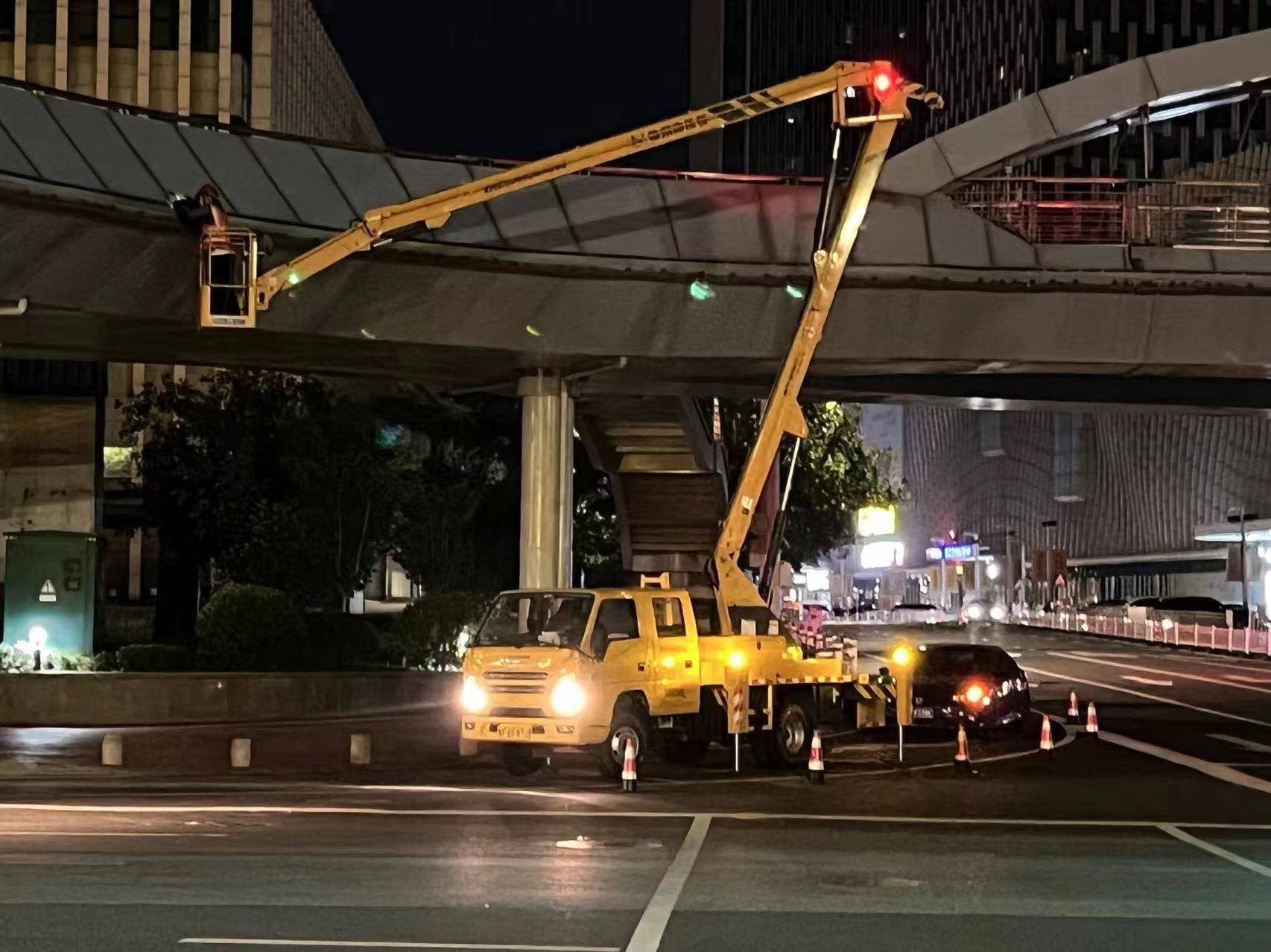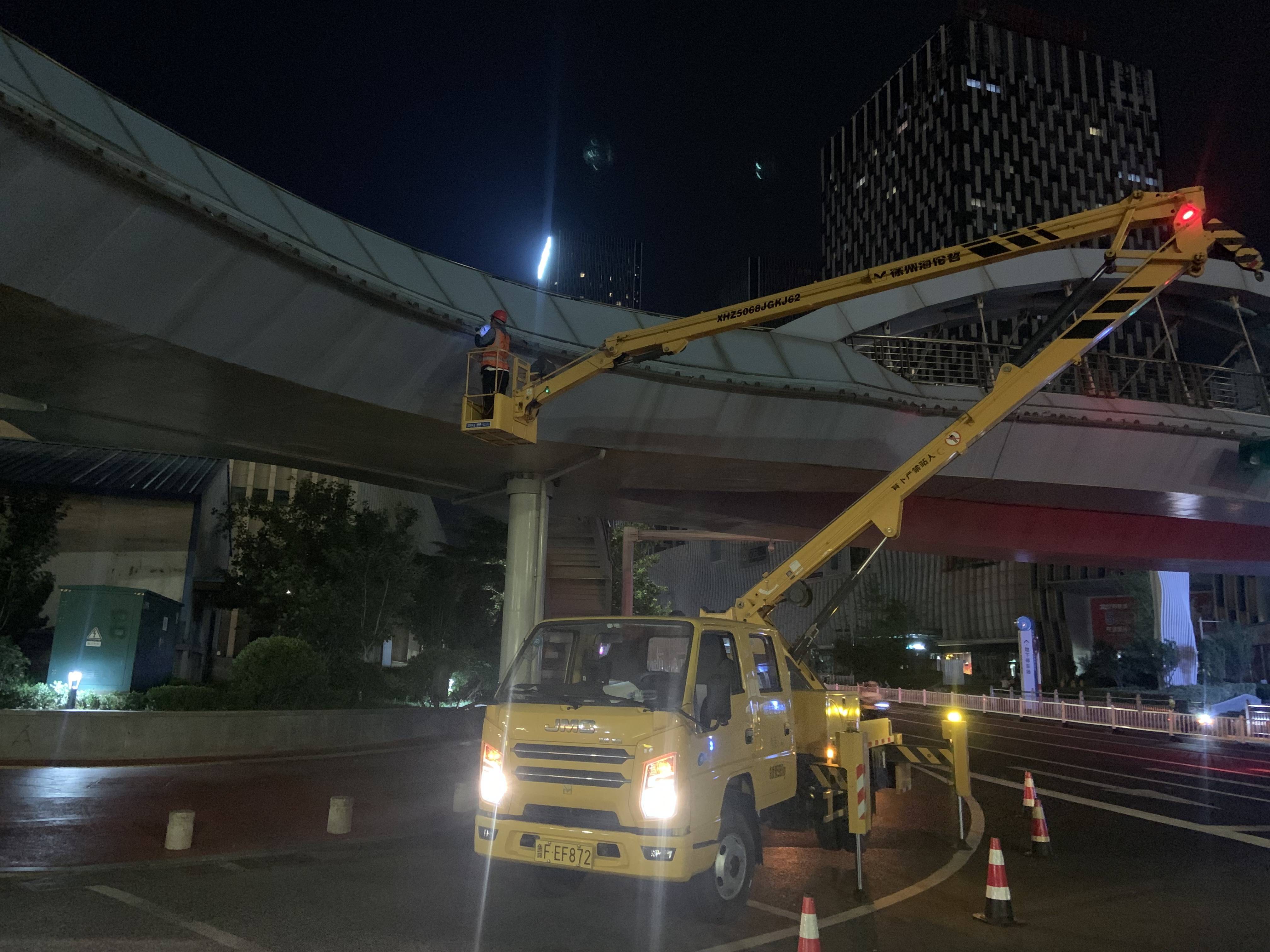 大小新闻7月24日讯(YMG全媒体记者 杨春娜 通讯员 王丽 摄影报道)23日晚上夜晚11点,在芝罘区西南河天桥旁,两台高空施工作业车分别停在天桥两侧,对天桥上的亮化设施进行全面排查整修,为确保施工安全高效,现场工作人员设置安全反光锥和车辆引导标识,两个维修班组同步作业,直至太阳初升才收工。