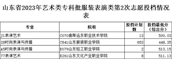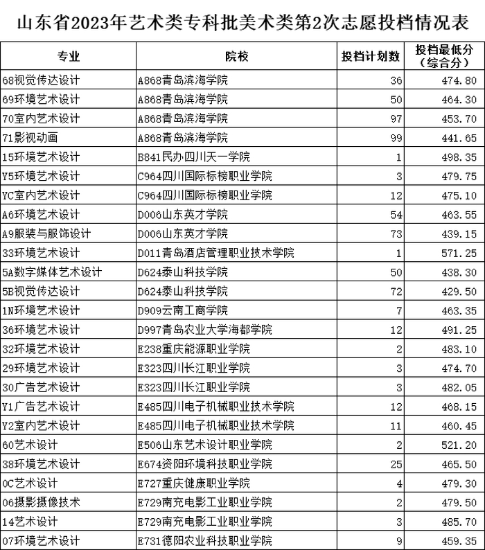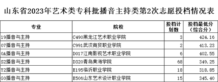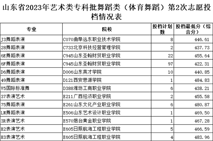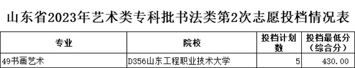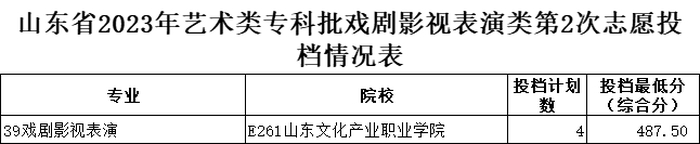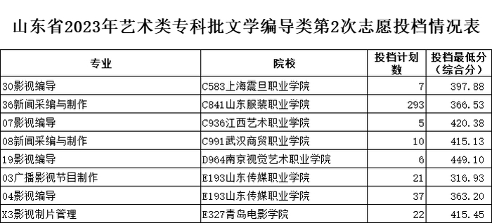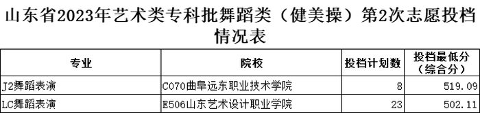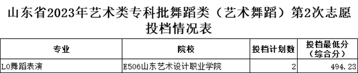 山东省2023年艺术类专科批第2次志愿投档情况表