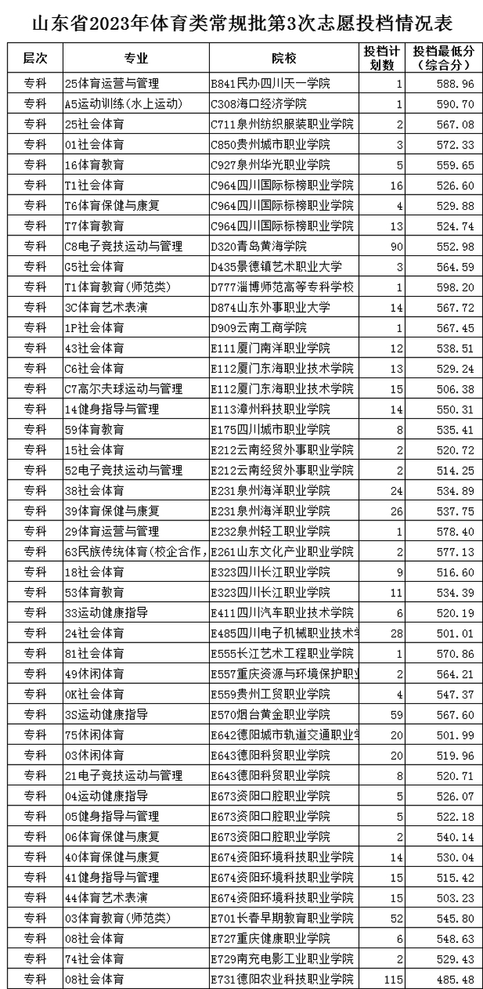 山东省2023年体育类常规批第3次志愿投档情况表