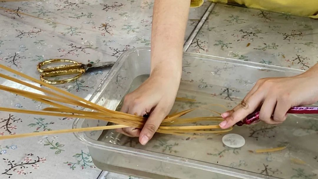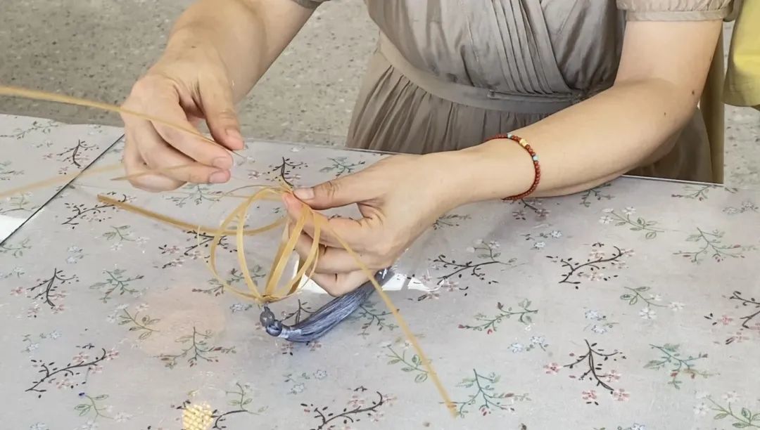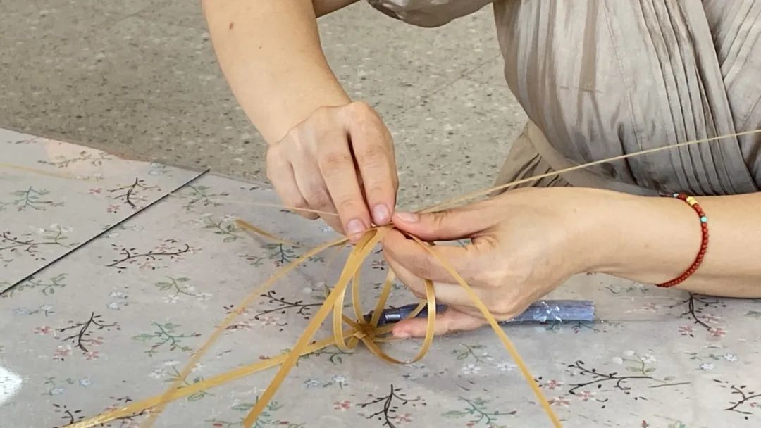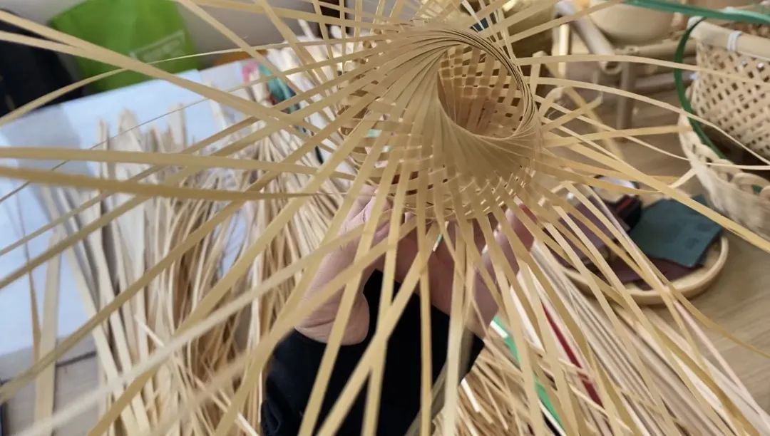 了解完手工油纸伞的相关细节,张老师亲自带领调研小组的同学们体验竹编工艺。看着一根根竹条在张老师手指间穿梭,香囊的整体结构被稳定地把握住,张老师有节奏地进行编织,古老的技艺又一次在我们面前重现。