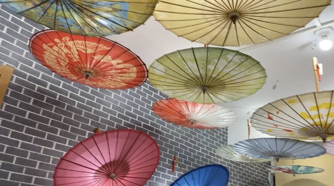 进入体验馆后映入眼帘的是一个个精致的油纸伞,这里的氛围十分幽静,馆内装饰简约又充满传统气息,墙上挂着各种油纸伞的图片和介绍。