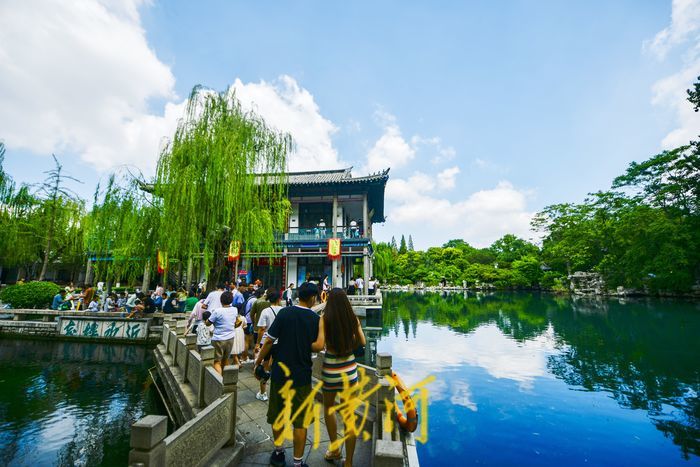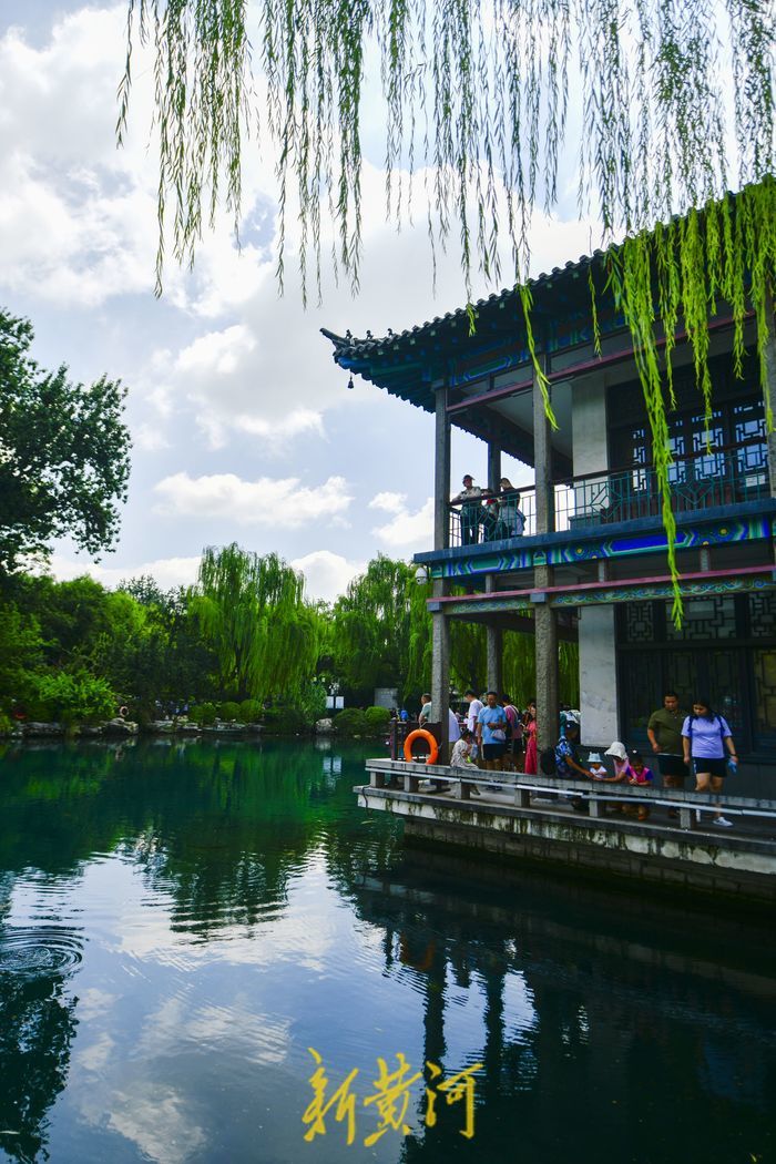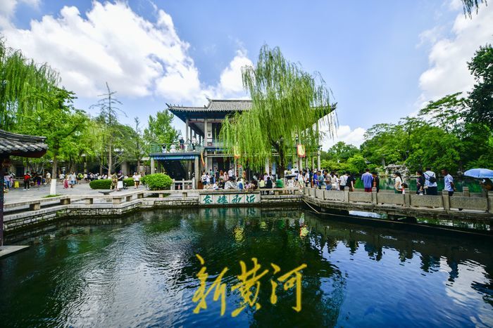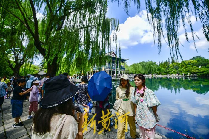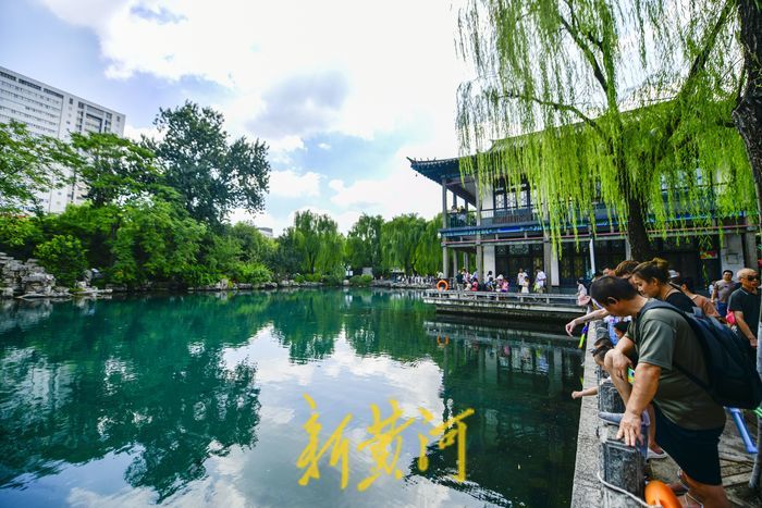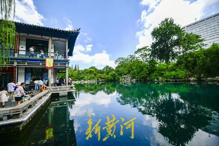 在五龙潭公园内,雨后的泉水喷涌更加汹涌,蓝天白云倒映在泉水中。众多游客漫步泉边,呼吸着清新的空气,感受雨后的“天然氧吧”。
