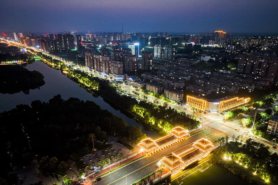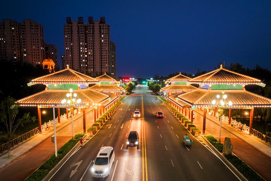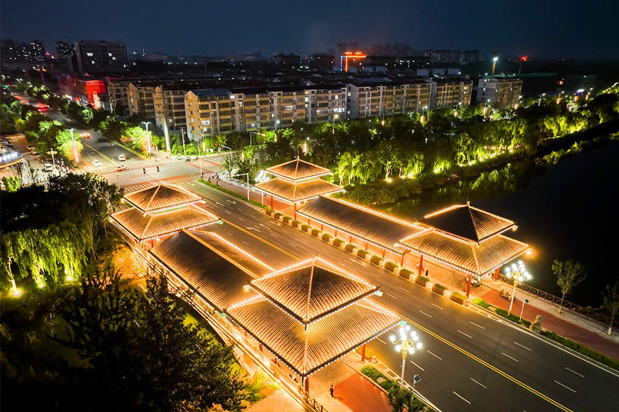 8月20日,夜幕降临,古色古香的冠县清泉廊桥彩灯亮起,霓虹璀璨、美轮美奂。