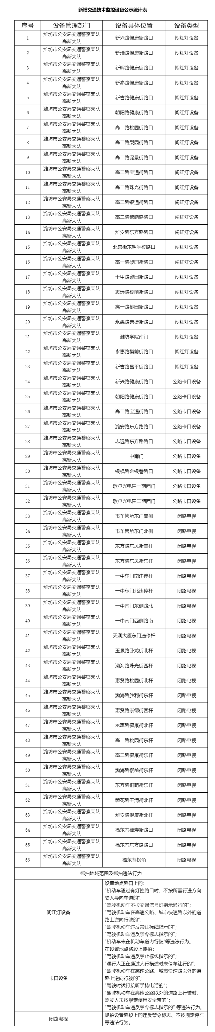 潍坊市公安局交通警察支队高新大队新增56处共185个(闯红灯设备23处121个,公路卡口9处40个,违停24处24个)交通技术监控设备,现对以下设备予以公示,自公示之日起5个工作日后,将对有关交通违法行为进行依法管理,请广大交通参与者自觉遵守道路交通法律法规,共同维护良好的道路交通环境。