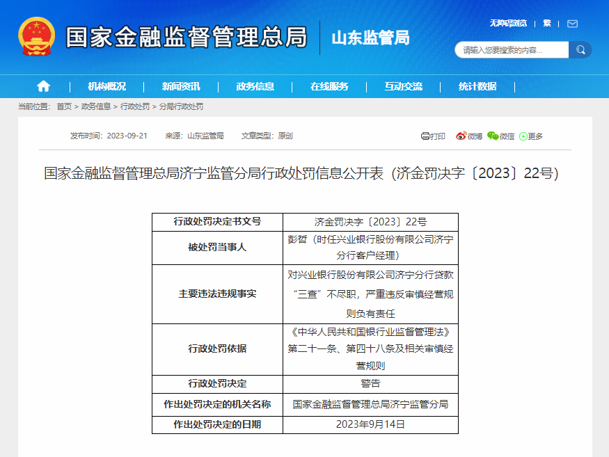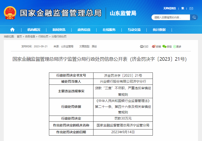 9月14日,国家金融监督管理总局济宁监管分局对兴业银行股份有限公司济宁分行作出处罚决定。