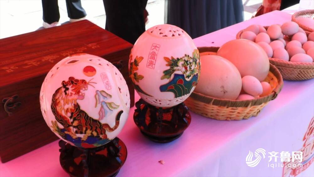 鄄城县郑营镇展区主打“生态”牌,冯庄生态园自产的蔬菜、土鸡蛋、土鹅蛋琳琅满目,其中自产的鸵鸟蛋及手工艺品更是让人眼前一亮。鄄城县郑营镇展区工作人员张霞介绍,正常的鸵鸟蛋市场售价大约是150元一个,通过老手艺人手工制作之后,鸵鸟蛋的蛋壳可以卖到300元。
