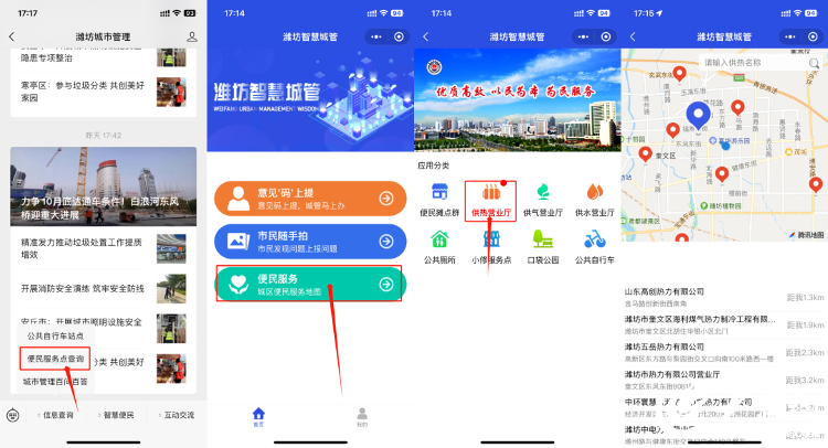潍坊市城管执法支队依托城市运行管理服务平台,第一时间更新升级了供热营业厅点位电子地图。供热营业厅便民服务地图共包含城区9家热力公司14个线下收费点位,市民可以通过潍坊城市管理微信公众号查询地图,具体操作如下: