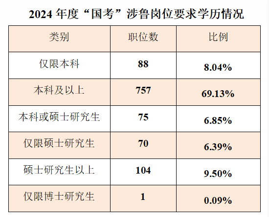 涉鲁职位对于学历的要求整体是比较高的,1095个岗位全部要求本科或硕士及以上学历,专科学历不能报考。本科生可以报考的岗位占到所有岗位的77%以上,硕士研究生可以报考的岗位占91%。