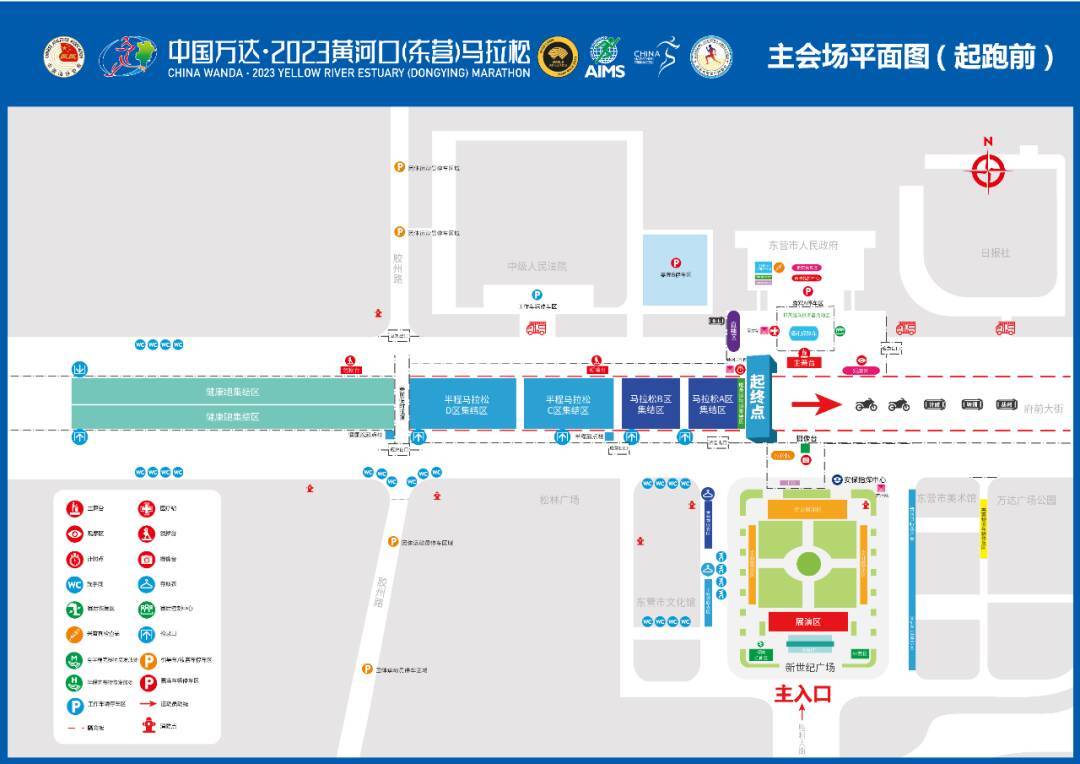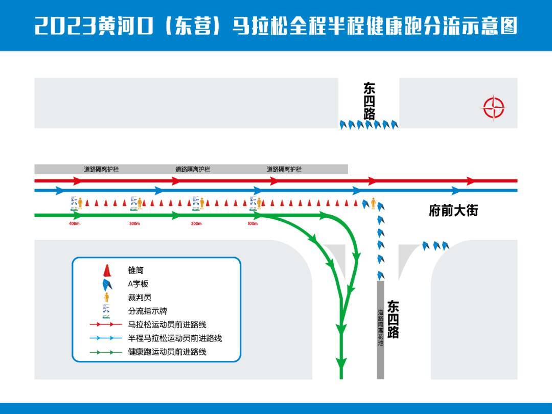 报到及检录时间:6:15-7:15。运动员在府前大街与东三路交叉路口下车,步行进入赛道,到达马拉松健康跑检录口(黄河影剧院附近)进行检录(详见下图),团队参赛由领队统一到检录处检录。检录完成后按先后顺序依次由东向西排列。