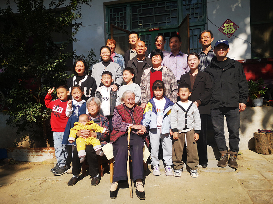 年逾百岁的张永英是这个拥有47人大家庭的“家长”。这个大家庭如今已经是五世同堂。
