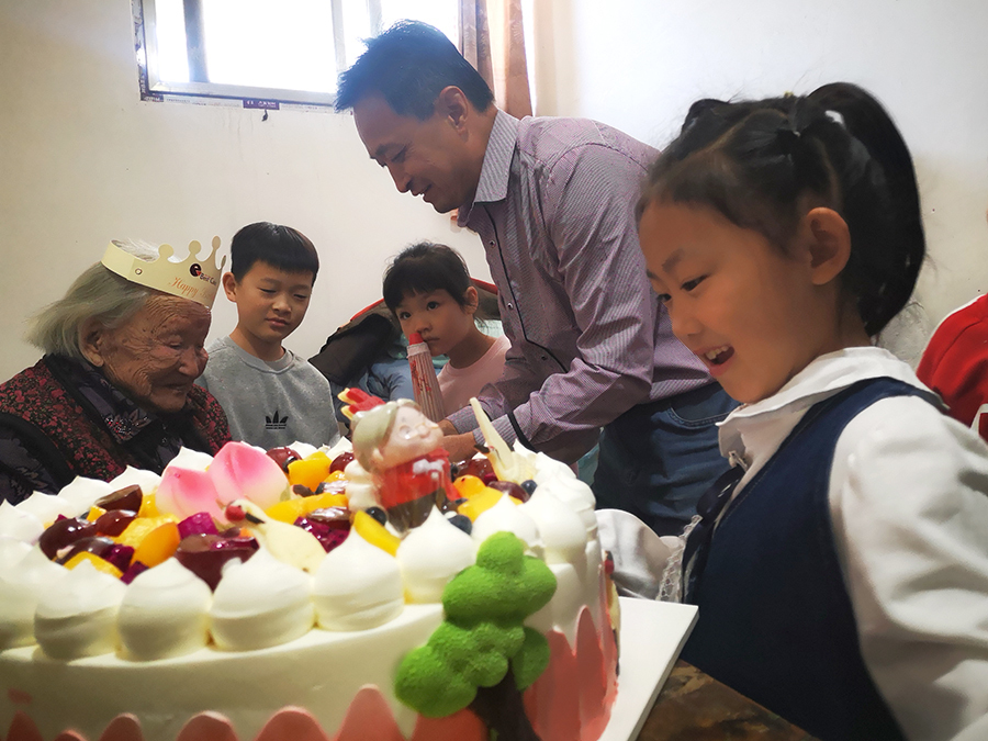 10月21日,秋天的阳光格外干净,树上的喜鹊不断发出清脆的鸣叫。张永英的子孙们聚集到她的身边,送上了带有“寿”字的蛋糕,分享着幸福和快乐,这一幕发生在东阿县刘集镇西三合村一处绿树环抱的农家院落里。