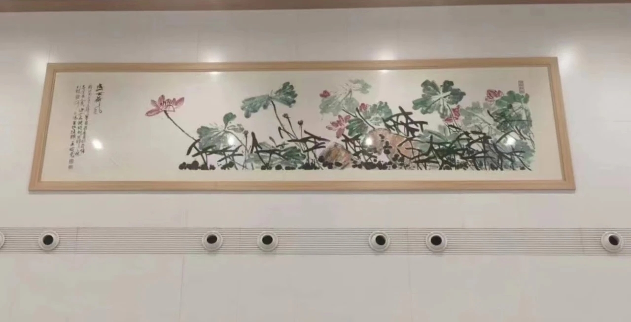 近日,著名画家王晓光倾情创作的横12米、纵3.3米巨幅国画《盛世荷风》在济郑高铁莘县站候车大厅精彩亮相。画作以徒骇河流域盛开的荷花为创作源泉,用笔豪放大气,格调清新淡雅,令人赞叹不已。