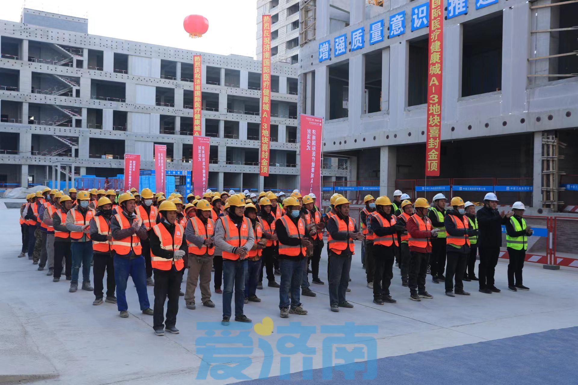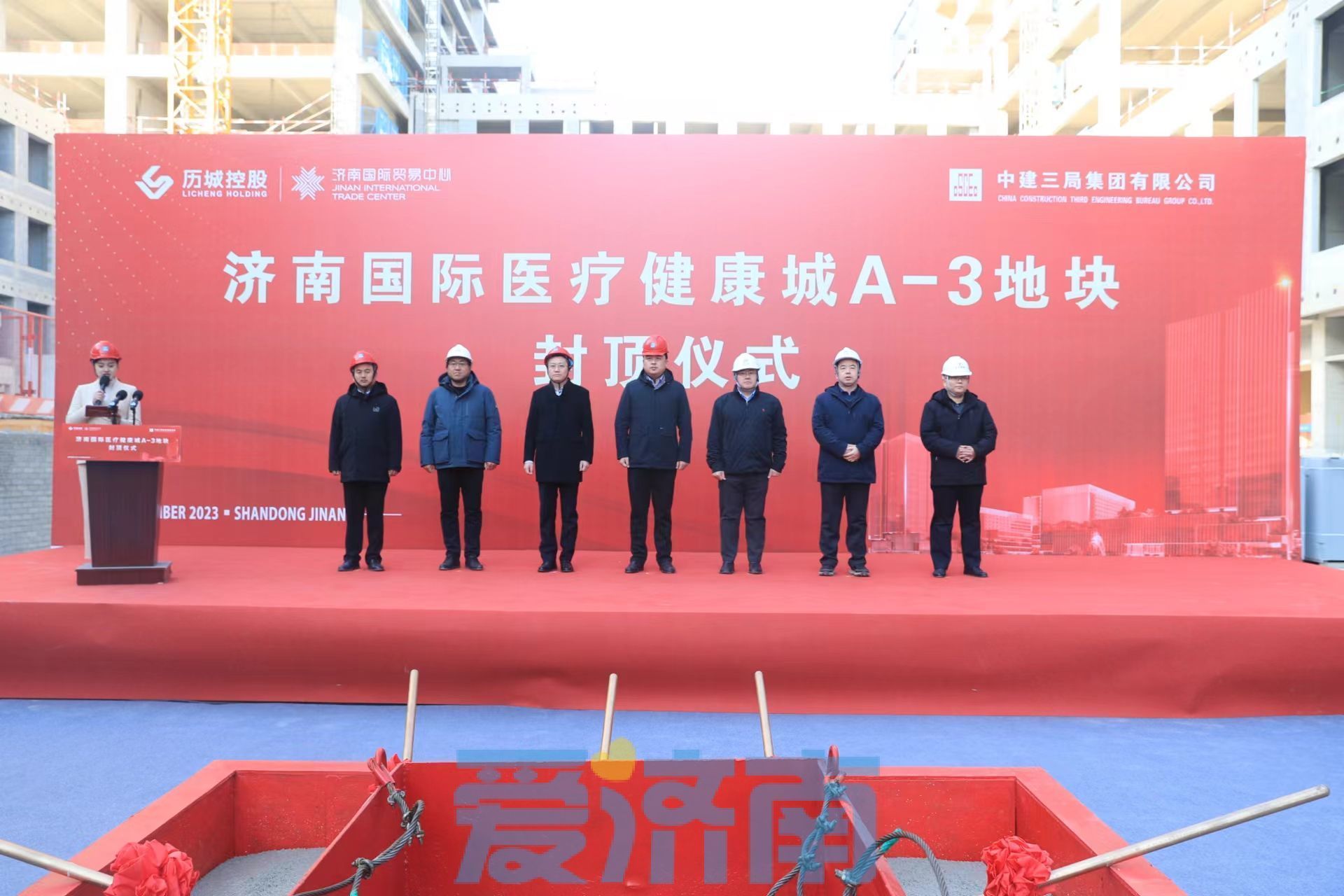 12月1日,济南国际医疗健康城A-3地块封顶仪式在施工现场隆重举行。唐冶街道办事处、历城控股集团、中建三局总承包公司山东公司、天宇工程咨询有限公司相关负责同志及职工代表,工人班组代表等共计百余人参加了仪式。