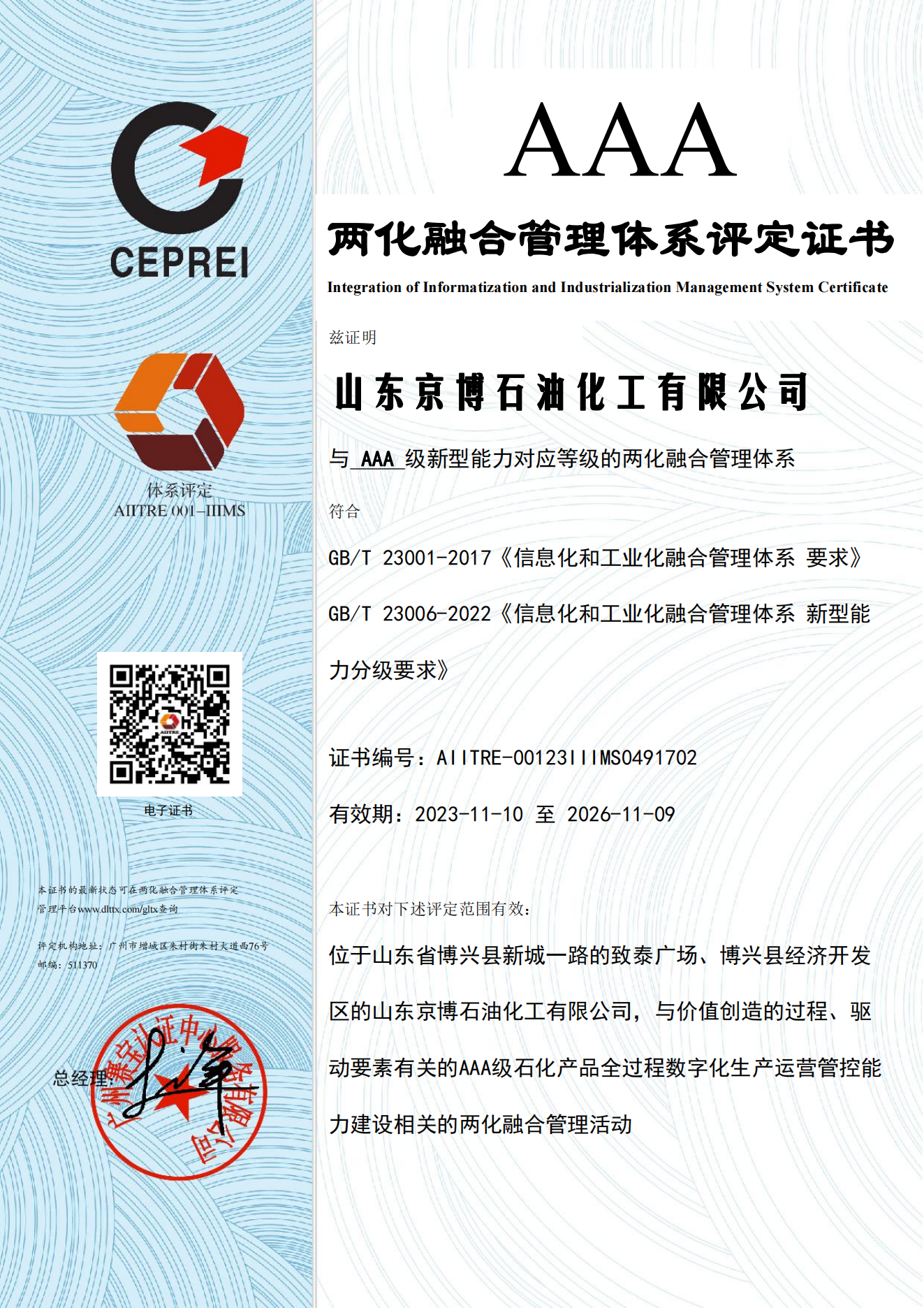 近日,山东京博石油化工有限公司(以下简称“京博石化”)顺利通过国家工业和信息化部《信息化和工业化融合管理体系要求》(GB/T 23001-2017)及《信息化和工业化融合管理体系新型能力分级要求》(GB/T 23006-2022)体系认证审核,正式取得两化融合管理体系目前开放申请的最高等级——AAA级认证证书,标志着京博石化在推进信息化和工业化深度融合方面获得国家最权威认可,展现了企业在两化融合方面的实施成果和优异综合实力,将有力助推京博石化在装备本体智能化、运行控制智能化、运营方案智能化的可持续发展。