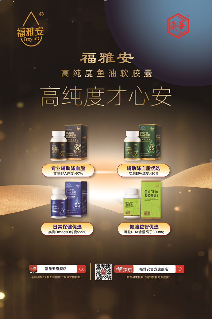 除了技术领先,该品牌还有多重产品优势。鱼油原料来自秘鲁渔场单一凤尾鱼种,经过149项项目检测,19项核辐射检测,保证源头安全;生产环节采用国际先进的分子蒸馏提纯技术,多级提纯,能生产EPA-EE纯度≥98%,DHA-EE纯度≥95%产品;14.7mm鱼油长度比普通颗粒鱼油小一倍,更易吞服……基于此,福雅安品牌系列成为市场影响力、占有率一流的鱼油品牌。