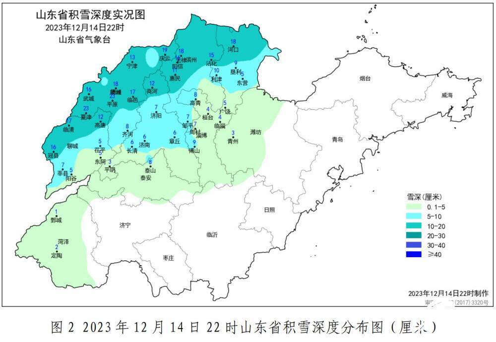 有17个县(区市)积雪深度超过10厘米,排在前5位的是:德州平原23厘米、德州夏津23厘米、德州庆云19厘米、东营河口18厘米、滨州无棣18厘米。济南降雪量12毫米,积雪深度6厘米。