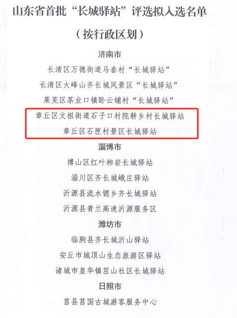 为贯彻落实《长城国家文化公园(山东段)建设保护规划》,深入推进长城国家文化公园建设,发挥典型示范的引领作用,经区、市文化和旅游局、省有关部门推荐申报,省文化和旅游厅按程序组织评选,章丘区文祖街道石子口村院耕乡村长城驿站、官庄街道石匣村景区长城驿站成功入选山东省首批“长城驿站”。
