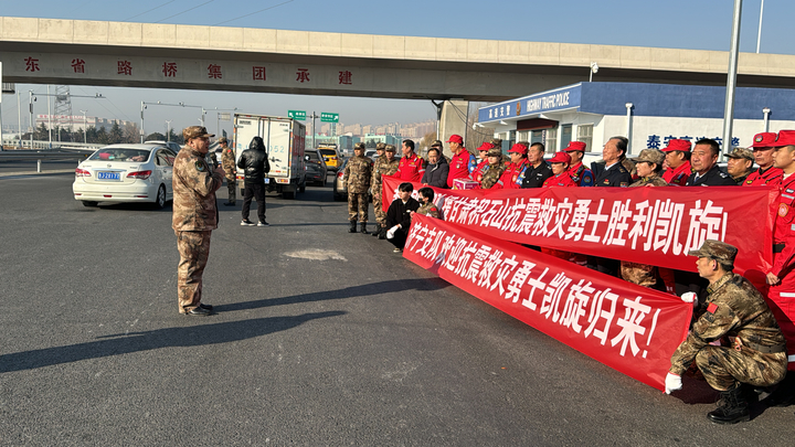 12月25日,中国国际救援中心山东省救援总队退役军人特勤支队从甘肃返抵泰安。当日上午10时,在泰安南高速路出口,战友们列队迎接。