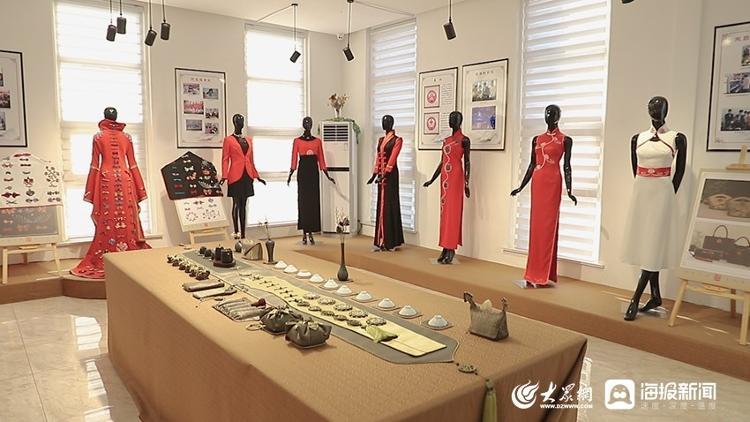 “除了传统的盘扣,我们还结合身边的元素进行创新,像这些作品都是融入了五莲元素的。”刘冬梅将刘氏盘扣技艺融入太阳文化、茶文化、海洋文化等元素,进行再创作,实现了非物质文化遗产的创造性转化与创新性发展。其中,她设计带有“仁义礼智信“和五莲山水元素的“茶蕴五常”盘扣旗袍茶席,在2020“黄河杯”山东文化创意设计大赛中获得大奖,这也是日照市唯一一件获奖的非遗作品。