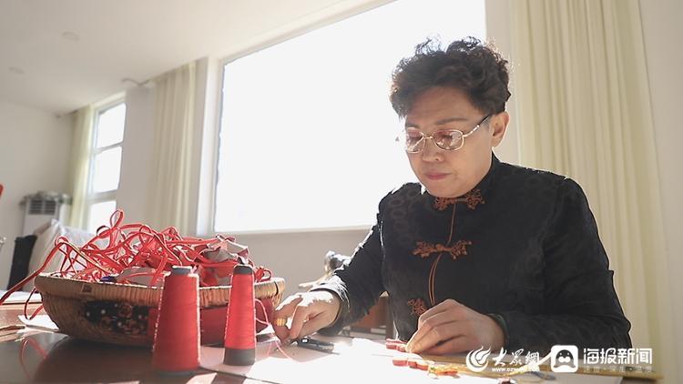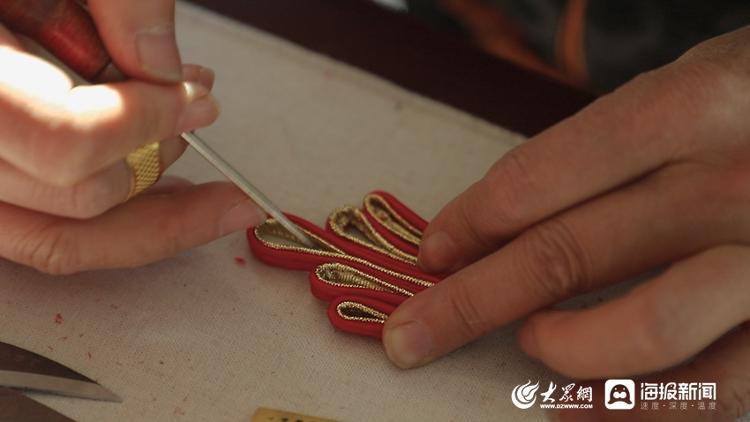 近日,大众网·海报新闻记者来到五莲刘氏盘扣非遗工坊,见到了刘冬梅,此时她正在精心制作一款具有虎元素的盘扣。一针一线的穿梭,弯弯曲曲的排列,盘绕缠缝间,一对精美的盘扣便在刘冬梅的手中完成。